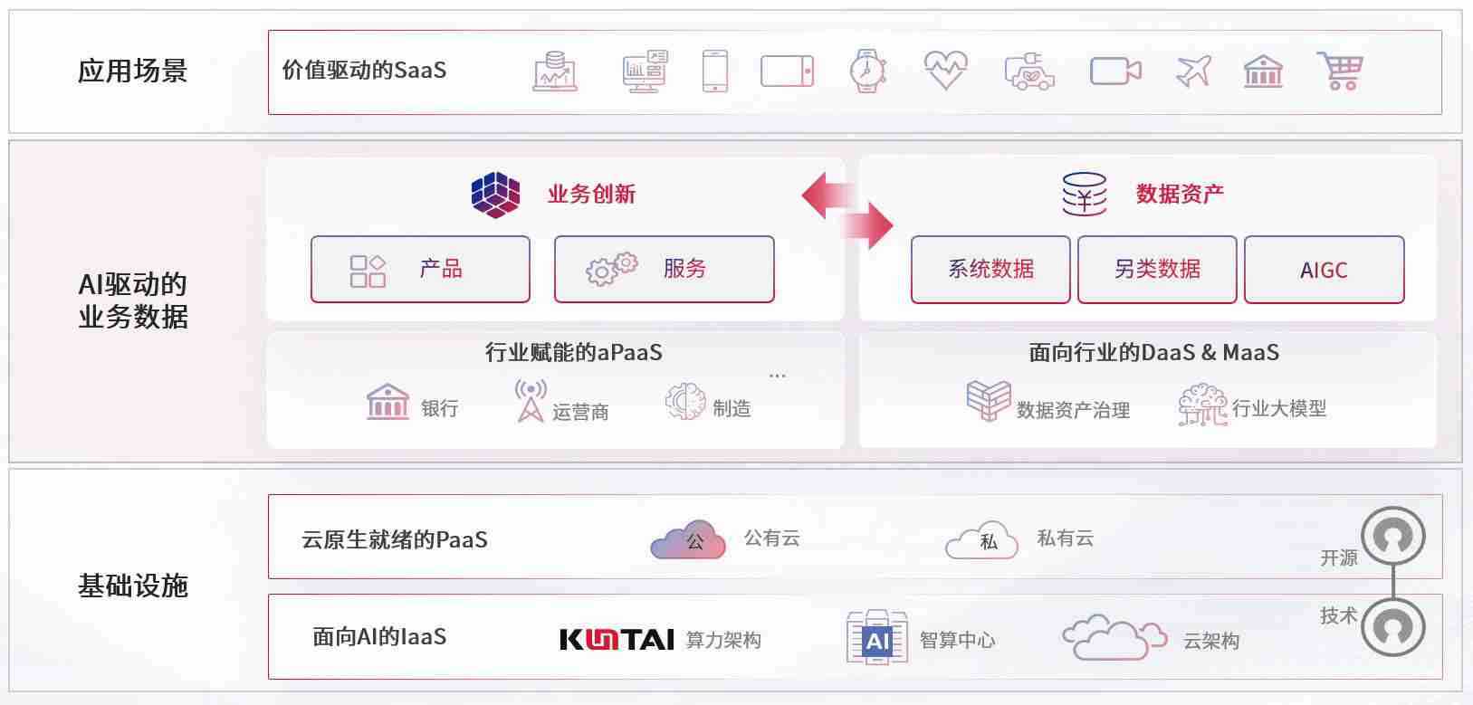 数字时代,,,,围绕企业数字化转型的关键要素,,,狗子28数码开创性的提出数云融合战略和技术体系框架,,,着力在云原生、、数字原生、、、、AI原生和信创产业上架构产品和服务能力,,,,为处在不同数字化转型阶段的快消零售、、、汽车、、、金融、、医疗、、、政企、、、教育、、、、运营商等行业客户提供泛在的敏捷IT能力和融合的数据驱动能力,,,,构建跨界融合创新的数字业务场景和新业务模式,,助力企业级客户建立面向未来的核心能力和竞争优势,,,,全面推动社会的数字化、、智能化转型升级。。。。